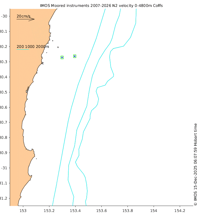 These maps show some basic analyses of the velocity data: mean (all-time in black and seasonal in colour) and sub-tidal variance for several layers and time-windows, and tidal harmonics for the depth-average velocity using the whole record. Click through to see more detailed plots of the selected dataset or to download those data from the AODN thredds server.