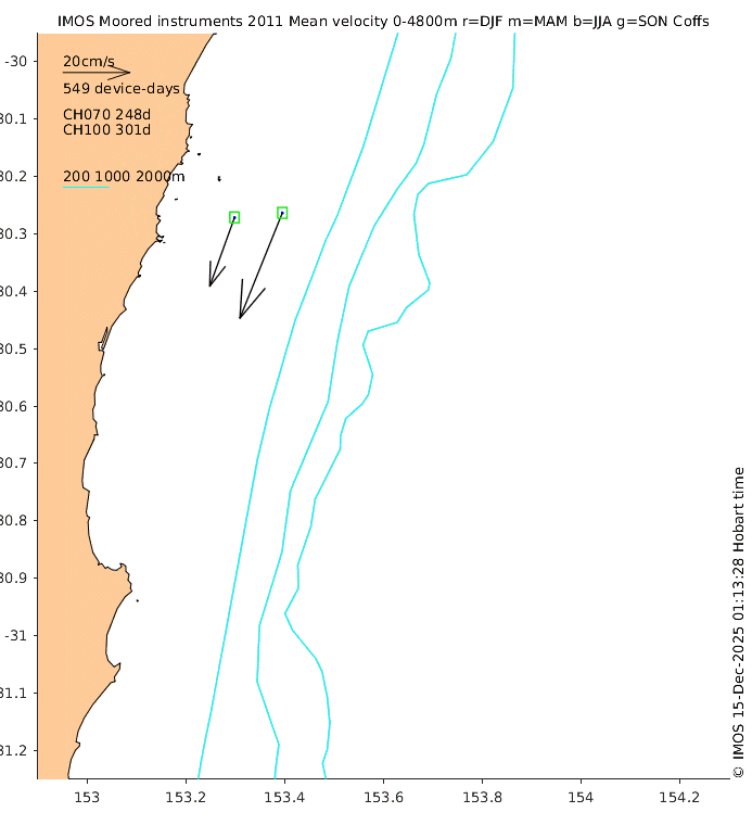 These maps show some basic analyses of the velocity data: mean (all-time in black and seasonal in colour) and sub-tidal variance for several layers and time-windows, and tidal harmonics for the depth-average velocity using the whole record. Click through to see more detailed plots of the selected dataset or to download those data from the AODN thredds server.