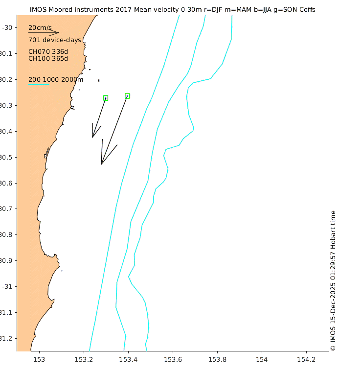 These maps show some basic analyses of the velocity data: mean (all-time in black and seasonal in colour) and sub-tidal variance for several layers and time-windows, and tidal harmonics for the depth-average velocity using the whole record. Click through to see more detailed plots of the selected dataset or to download those data from the AODN thredds server.