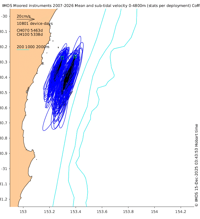 These maps show some basic analyses of the velocity data: mean (all-time in black and seasonal in colour) and sub-tidal variance for several layers and time-windows, and tidal harmonics for the depth-average velocity using the whole record. Click through to see more detailed plots of the selected dataset or to download those data from the AODN thredds server.