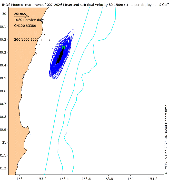 These maps show some basic analyses of the velocity data: mean (all-time in black and seasonal in colour) and sub-tidal variance for several layers and time-windows, and tidal harmonics for the depth-average velocity using the whole record. Click through to see more detailed plots of the selected dataset or to download those data from the AODN thredds server.