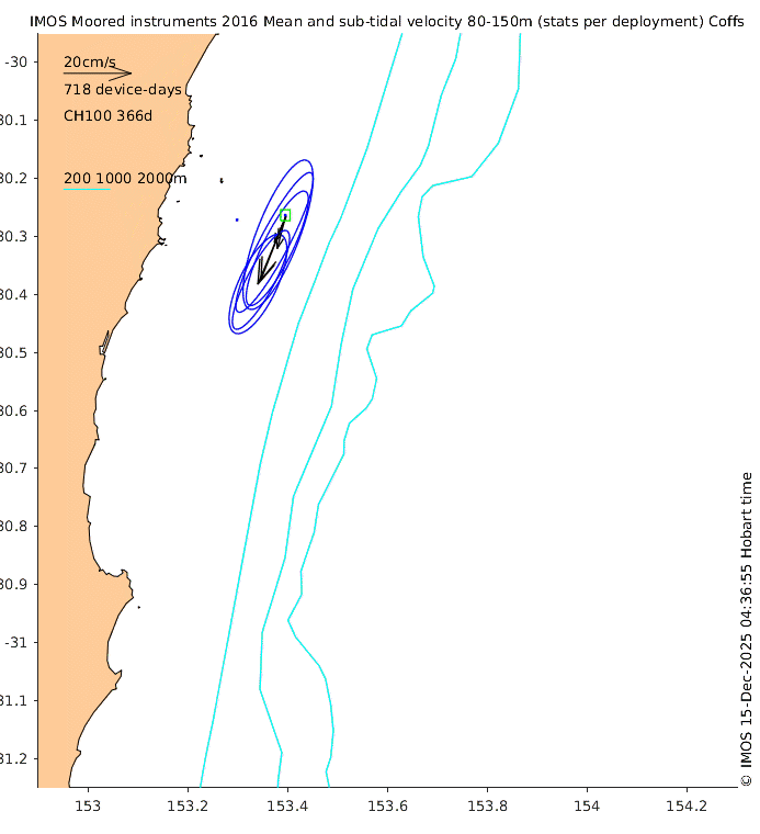These maps show some basic analyses of the velocity data: mean (all-time in black and seasonal in colour) and sub-tidal variance for several layers and time-windows, and tidal harmonics for the depth-average velocity using the whole record. Click through to see more detailed plots of the selected dataset or to download those data from the AODN thredds server.