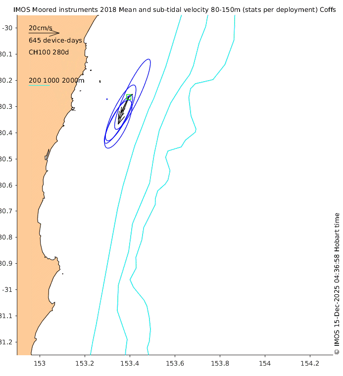 These maps show some basic analyses of the velocity data: mean (all-time in black and seasonal in colour) and sub-tidal variance for several layers and time-windows, and tidal harmonics for the depth-average velocity using the whole record. Click through to see more detailed plots of the selected dataset or to download those data from the AODN thredds server.
