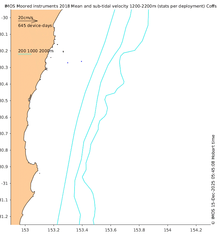 These maps show some basic analyses of the velocity data: mean (all-time in black and seasonal in colour) and sub-tidal variance for several layers and time-windows, and tidal harmonics for the depth-average velocity using the whole record. Click through to see more detailed plots of the selected dataset or to download those data from the AODN thredds server.