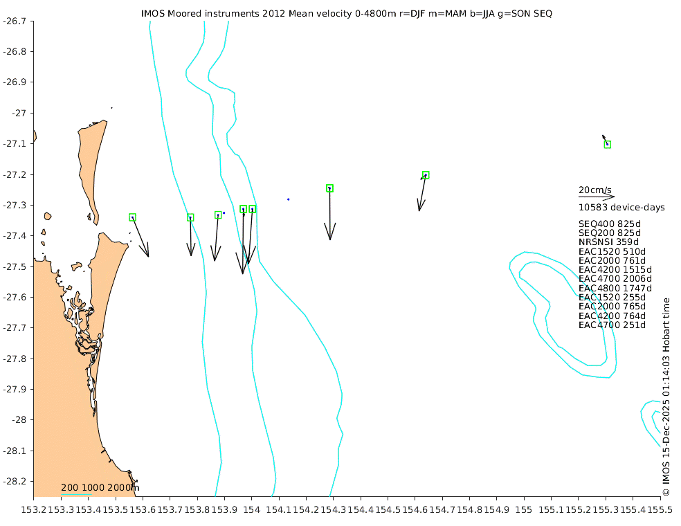 These maps show some basic analyses of the velocity data: mean (all-time in black and seasonal in colour) and sub-tidal variance for several layers and time-windows, and tidal harmonics for the depth-average velocity using the whole record. Click through to see more detailed plots of the selected dataset or to download those data from the AODN thredds server.
