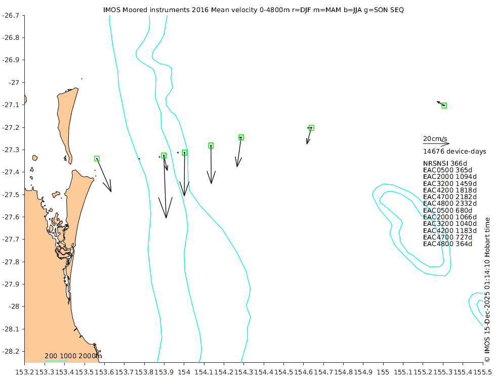 These maps show some basic analyses of the velocity data: mean (all-time in black and seasonal in colour) and sub-tidal variance for several layers and time-windows, and tidal harmonics for the depth-average velocity using the whole record. Click through to see more detailed plots of the selected dataset or to download those data from the AODN thredds server.