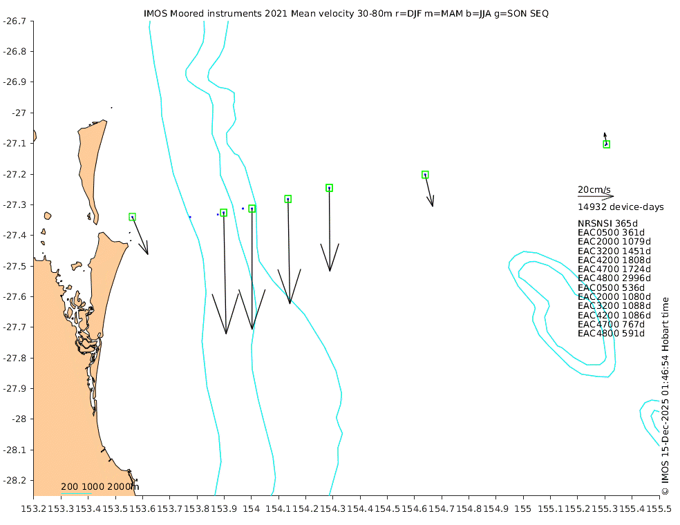 These maps show some basic analyses of the velocity data: mean (all-time in black and seasonal in colour) and sub-tidal variance for several layers and time-windows, and tidal harmonics for the depth-average velocity using the whole record. Click through to see more detailed plots of the selected dataset or to download those data from the AODN thredds server.