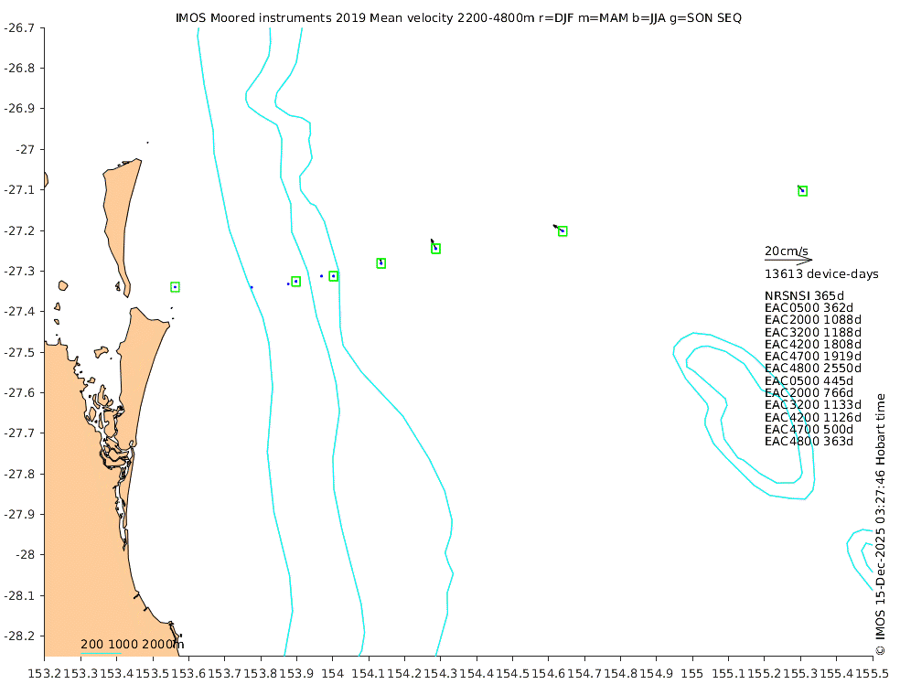 These maps show some basic analyses of the velocity data: mean (all-time in black and seasonal in colour) and sub-tidal variance for several layers and time-windows, and tidal harmonics for the depth-average velocity using the whole record. Click through to see more detailed plots of the selected dataset or to download those data from the AODN thredds server.
