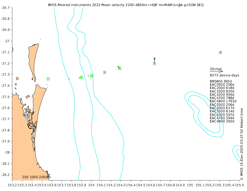 These maps show some basic analyses of the velocity data: mean (all-time in black and seasonal in colour) and sub-tidal variance for several layers and time-windows, and tidal harmonics for the depth-average velocity using the whole record. Click through to see more detailed plots of the selected dataset or to download those data from the AODN thredds server.