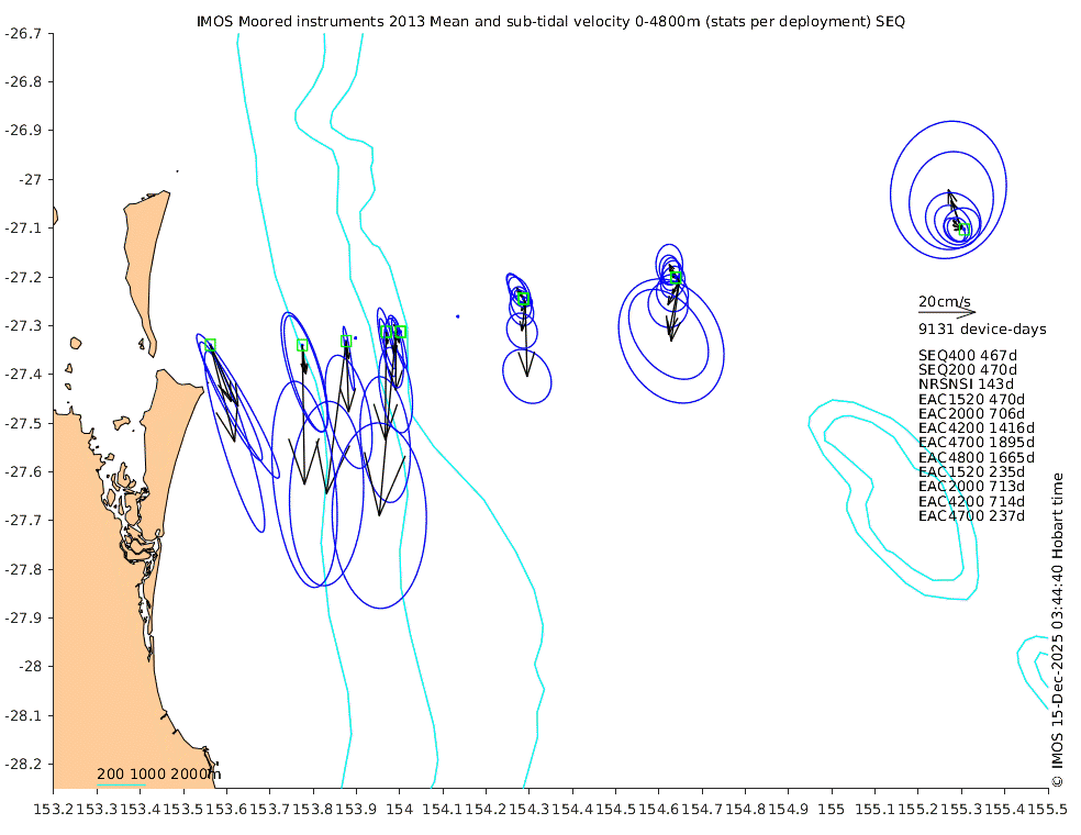 These maps show some basic analyses of the velocity data: mean (all-time in black and seasonal in colour) and sub-tidal variance for several layers and time-windows, and tidal harmonics for the depth-average velocity using the whole record. Click through to see more detailed plots of the selected dataset or to download those data from the AODN thredds server.