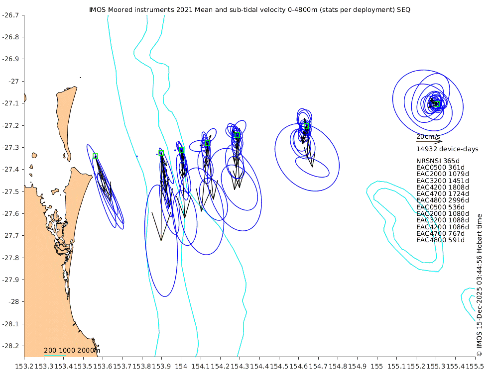 These maps show some basic analyses of the velocity data: mean (all-time in black and seasonal in colour) and sub-tidal variance for several layers and time-windows, and tidal harmonics for the depth-average velocity using the whole record. Click through to see more detailed plots of the selected dataset or to download those data from the AODN thredds server.
