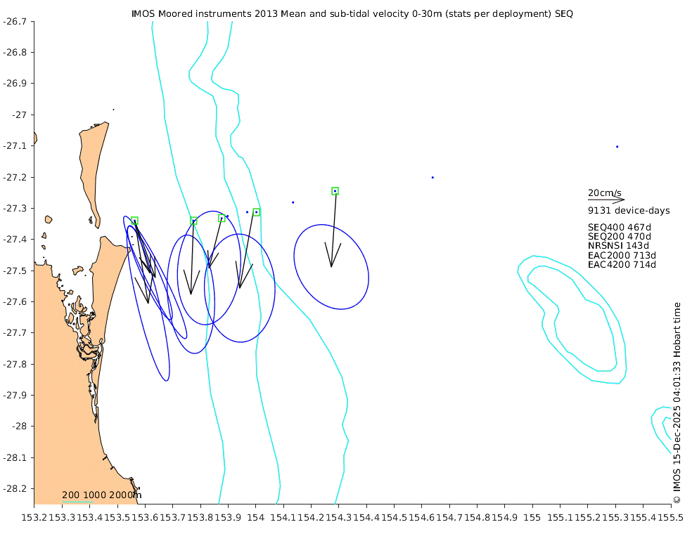 These maps show some basic analyses of the velocity data: mean (all-time in black and seasonal in colour) and sub-tidal variance for several layers and time-windows, and tidal harmonics for the depth-average velocity using the whole record. Click through to see more detailed plots of the selected dataset or to download those data from the AODN thredds server.