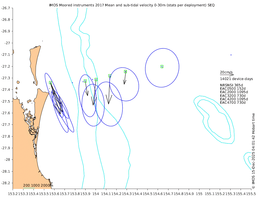 These maps show some basic analyses of the velocity data: mean (all-time in black and seasonal in colour) and sub-tidal variance for several layers and time-windows, and tidal harmonics for the depth-average velocity using the whole record. Click through to see more detailed plots of the selected dataset or to download those data from the AODN thredds server.