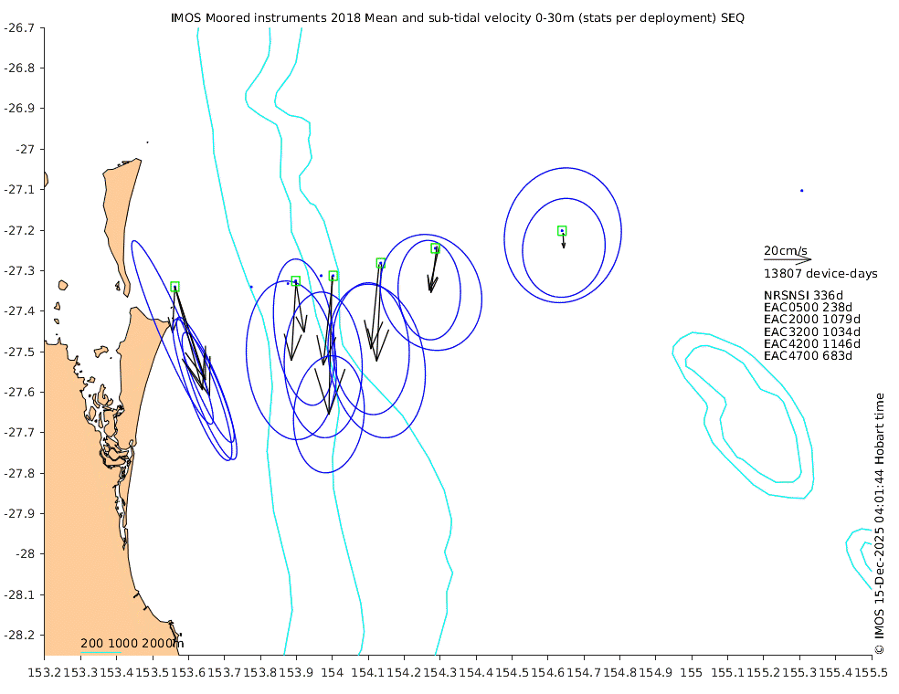 These maps show some basic analyses of the velocity data: mean (all-time in black and seasonal in colour) and sub-tidal variance for several layers and time-windows, and tidal harmonics for the depth-average velocity using the whole record. Click through to see more detailed plots of the selected dataset or to download those data from the AODN thredds server.