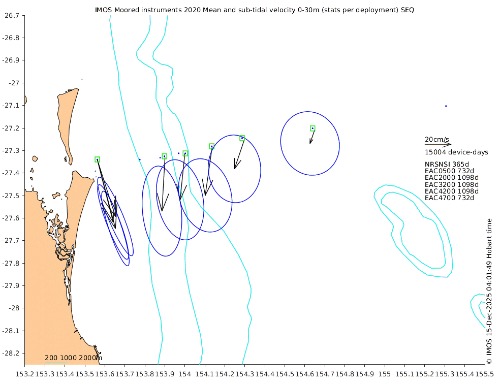 These maps show some basic analyses of the velocity data: mean (all-time in black and seasonal in colour) and sub-tidal variance for several layers and time-windows, and tidal harmonics for the depth-average velocity using the whole record. Click through to see more detailed plots of the selected dataset or to download those data from the AODN thredds server.
