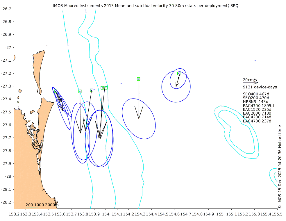 These maps show some basic analyses of the velocity data: mean (all-time in black and seasonal in colour) and sub-tidal variance for several layers and time-windows, and tidal harmonics for the depth-average velocity using the whole record. Click through to see more detailed plots of the selected dataset or to download those data from the AODN thredds server.