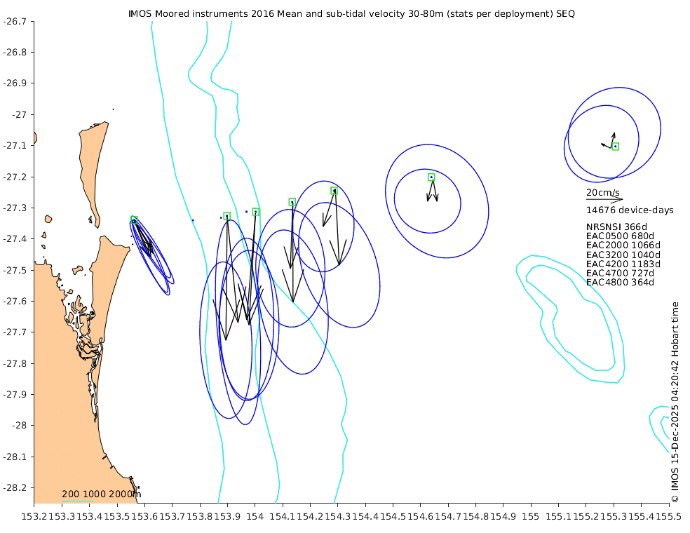 These maps show some basic analyses of the velocity data: mean (all-time in black and seasonal in colour) and sub-tidal variance for several layers and time-windows, and tidal harmonics for the depth-average velocity using the whole record. Click through to see more detailed plots of the selected dataset or to download those data from the AODN thredds server.