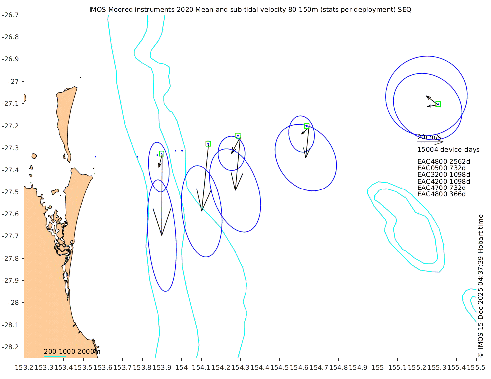 These maps show some basic analyses of the velocity data: mean (all-time in black and seasonal in colour) and sub-tidal variance for several layers and time-windows, and tidal harmonics for the depth-average velocity using the whole record. Click through to see more detailed plots of the selected dataset or to download those data from the AODN thredds server.