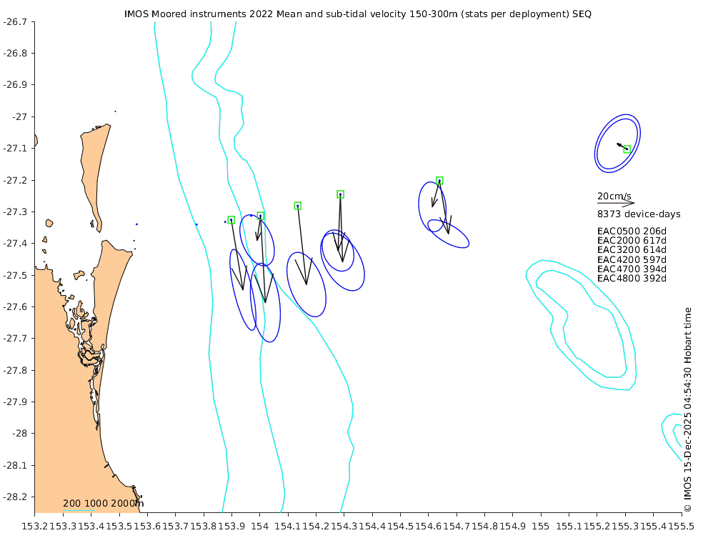 These maps show some basic analyses of the velocity data: mean (all-time in black and seasonal in colour) and sub-tidal variance for several layers and time-windows, and tidal harmonics for the depth-average velocity using the whole record. Click through to see more detailed plots of the selected dataset or to download those data from the AODN thredds server.