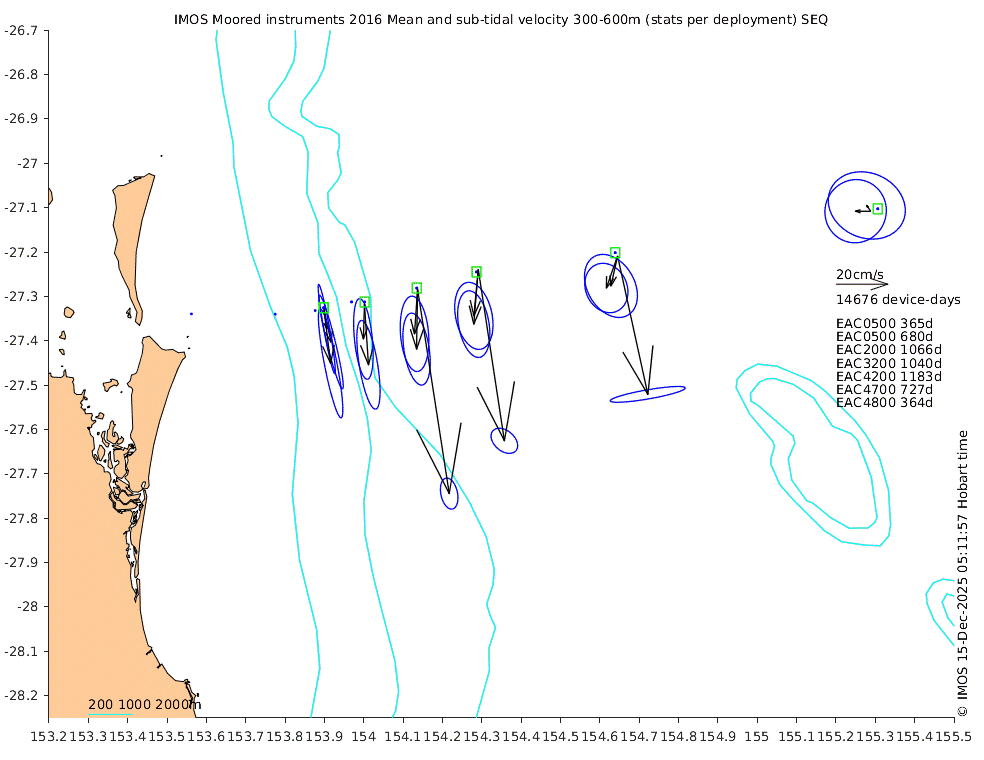 These maps show some basic analyses of the velocity data: mean (all-time in black and seasonal in colour) and sub-tidal variance for several layers and time-windows, and tidal harmonics for the depth-average velocity using the whole record. Click through to see more detailed plots of the selected dataset or to download those data from the AODN thredds server.