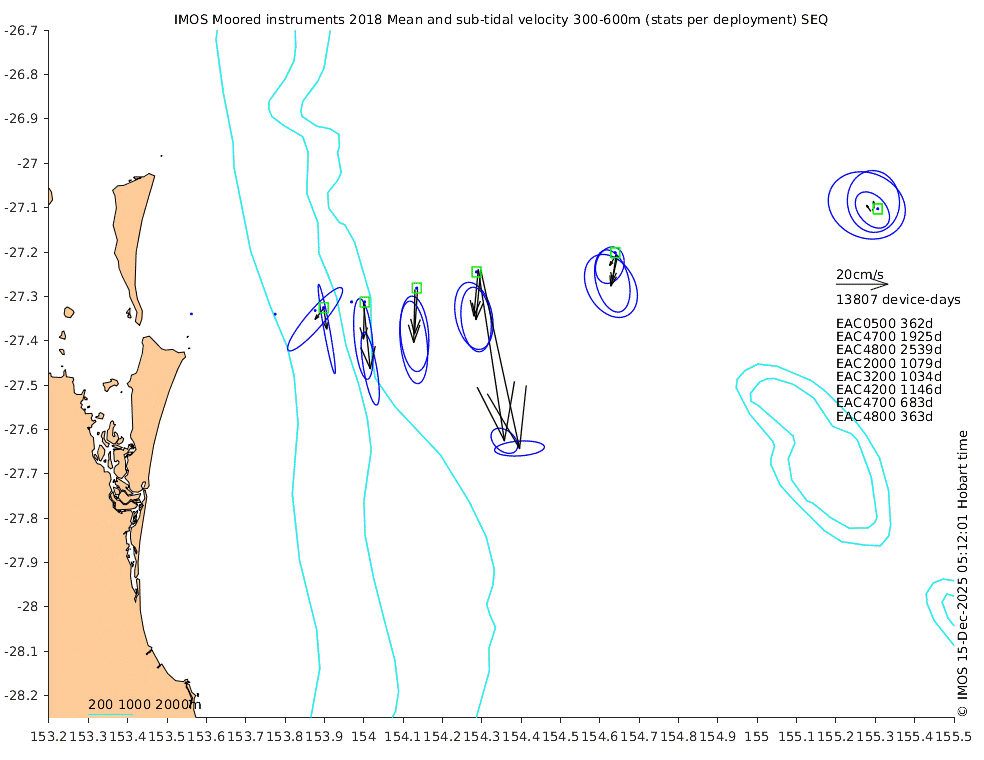 These maps show some basic analyses of the velocity data: mean (all-time in black and seasonal in colour) and sub-tidal variance for several layers and time-windows, and tidal harmonics for the depth-average velocity using the whole record. Click through to see more detailed plots of the selected dataset or to download those data from the AODN thredds server.
