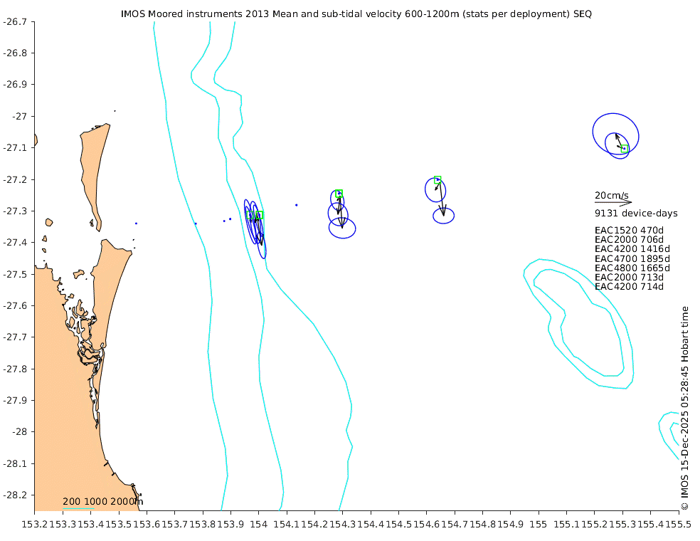 These maps show some basic analyses of the velocity data: mean (all-time in black and seasonal in colour) and sub-tidal variance for several layers and time-windows, and tidal harmonics for the depth-average velocity using the whole record. Click through to see more detailed plots of the selected dataset or to download those data from the AODN thredds server.
