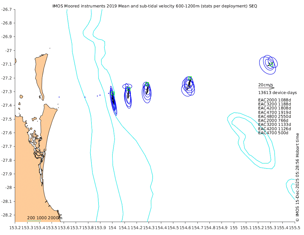 These maps show some basic analyses of the velocity data: mean (all-time in black and seasonal in colour) and sub-tidal variance for several layers and time-windows, and tidal harmonics for the depth-average velocity using the whole record. Click through to see more detailed plots of the selected dataset or to download those data from the AODN thredds server.