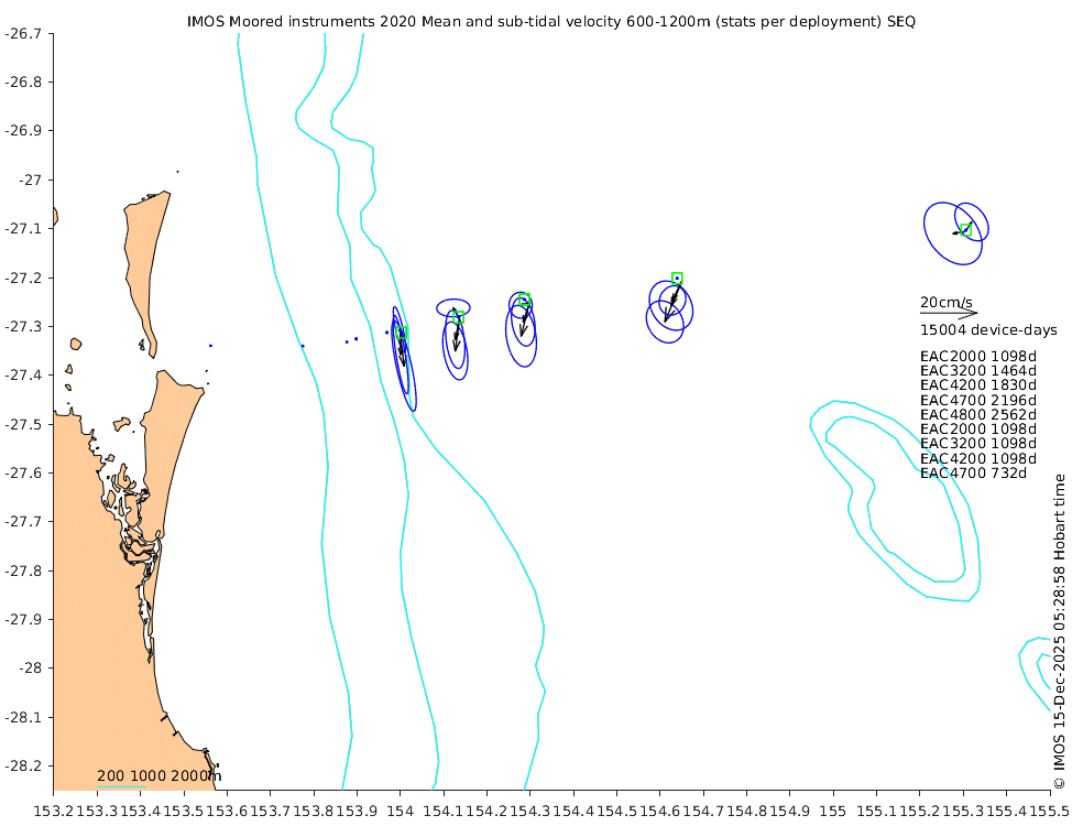 These maps show some basic analyses of the velocity data: mean (all-time in black and seasonal in colour) and sub-tidal variance for several layers and time-windows, and tidal harmonics for the depth-average velocity using the whole record. Click through to see more detailed plots of the selected dataset or to download those data from the AODN thredds server.