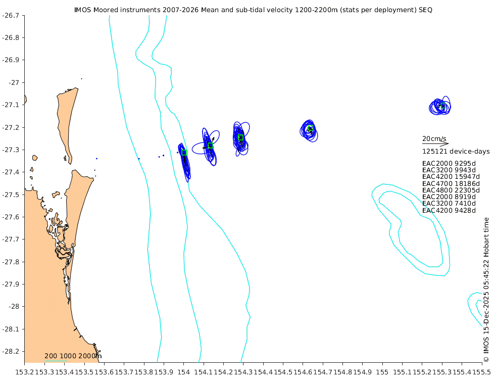 These maps show some basic analyses of the velocity data: mean (all-time in black and seasonal in colour) and sub-tidal variance for several layers and time-windows, and tidal harmonics for the depth-average velocity using the whole record. Click through to see more detailed plots of the selected dataset or to download those data from the AODN thredds server.