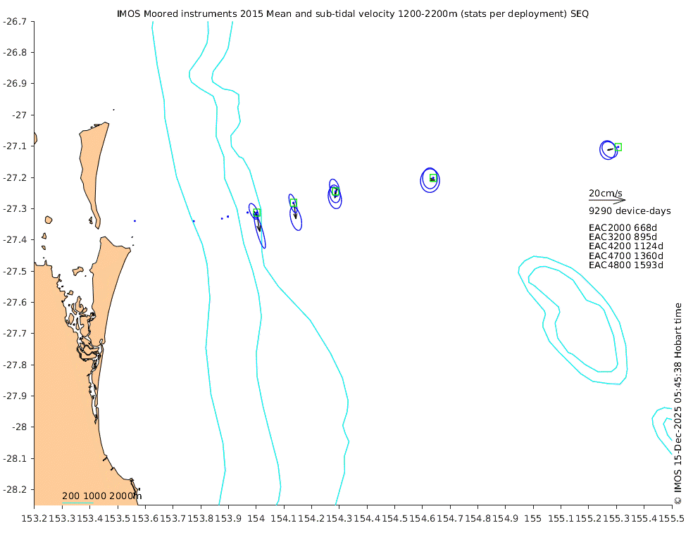 These maps show some basic analyses of the velocity data: mean (all-time in black and seasonal in colour) and sub-tidal variance for several layers and time-windows, and tidal harmonics for the depth-average velocity using the whole record. Click through to see more detailed plots of the selected dataset or to download those data from the AODN thredds server.