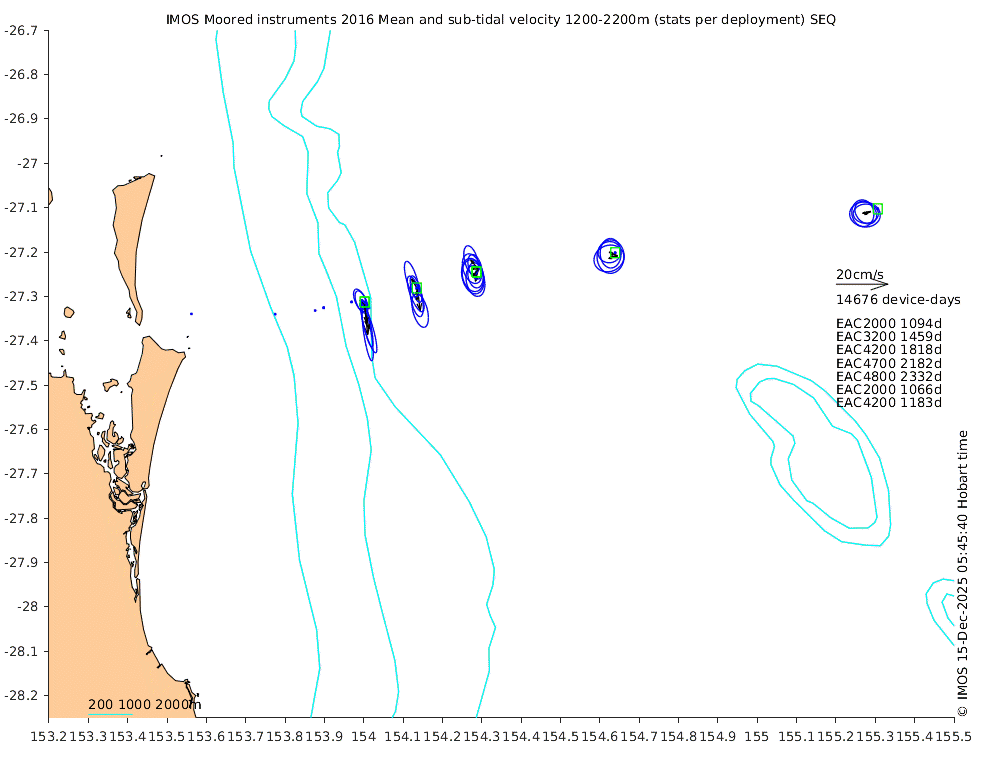 These maps show some basic analyses of the velocity data: mean (all-time in black and seasonal in colour) and sub-tidal variance for several layers and time-windows, and tidal harmonics for the depth-average velocity using the whole record. Click through to see more detailed plots of the selected dataset or to download those data from the AODN thredds server.