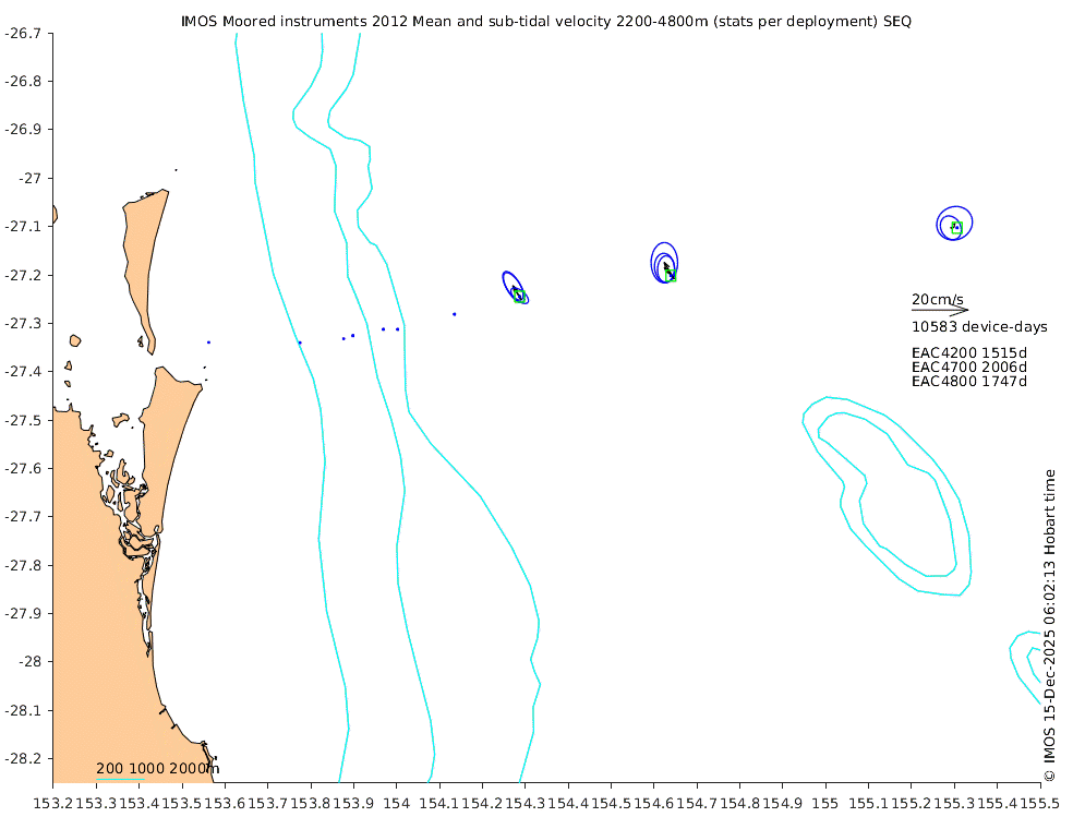 These maps show some basic analyses of the velocity data: mean (all-time in black and seasonal in colour) and sub-tidal variance for several layers and time-windows, and tidal harmonics for the depth-average velocity using the whole record. Click through to see more detailed plots of the selected dataset or to download those data from the AODN thredds server.