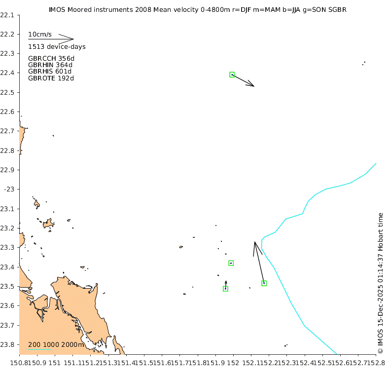 These maps show some basic analyses of the velocity data: mean (all-time in black and seasonal in colour) and sub-tidal variance for several layers and time-windows, and tidal harmonics for the depth-average velocity using the whole record. Click through to see more detailed plots of the selected dataset or to download those data from the AODN thredds server.