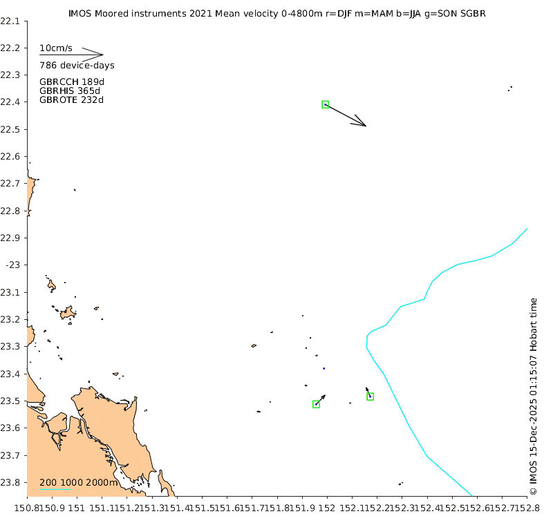 These maps show some basic analyses of the velocity data: mean (all-time in black and seasonal in colour) and sub-tidal variance for several layers and time-windows, and tidal harmonics for the depth-average velocity using the whole record. Click through to see more detailed plots of the selected dataset or to download those data from the AODN thredds server.