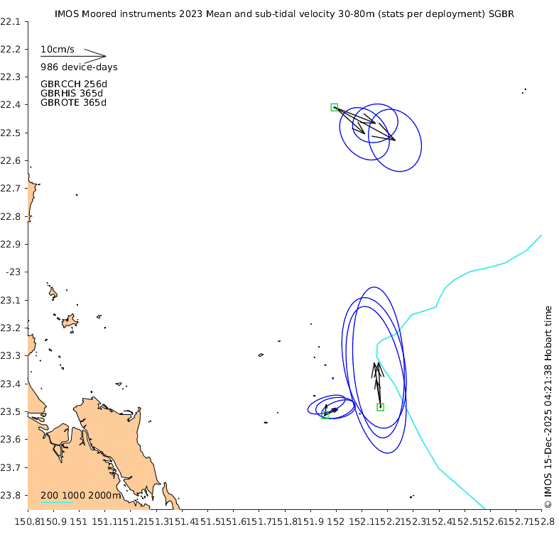 These maps show some basic analyses of the velocity data: mean (all-time in black and seasonal in colour) and sub-tidal variance for several layers and time-windows, and tidal harmonics for the depth-average velocity using the whole record. Click through to see more detailed plots of the selected dataset or to download those data from the AODN thredds server.