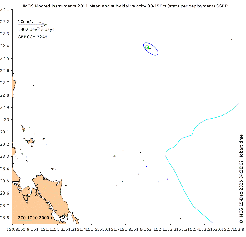 These maps show some basic analyses of the velocity data: mean (all-time in black and seasonal in colour) and sub-tidal variance for several layers and time-windows, and tidal harmonics for the depth-average velocity using the whole record. Click through to see more detailed plots of the selected dataset or to download those data from the AODN thredds server.