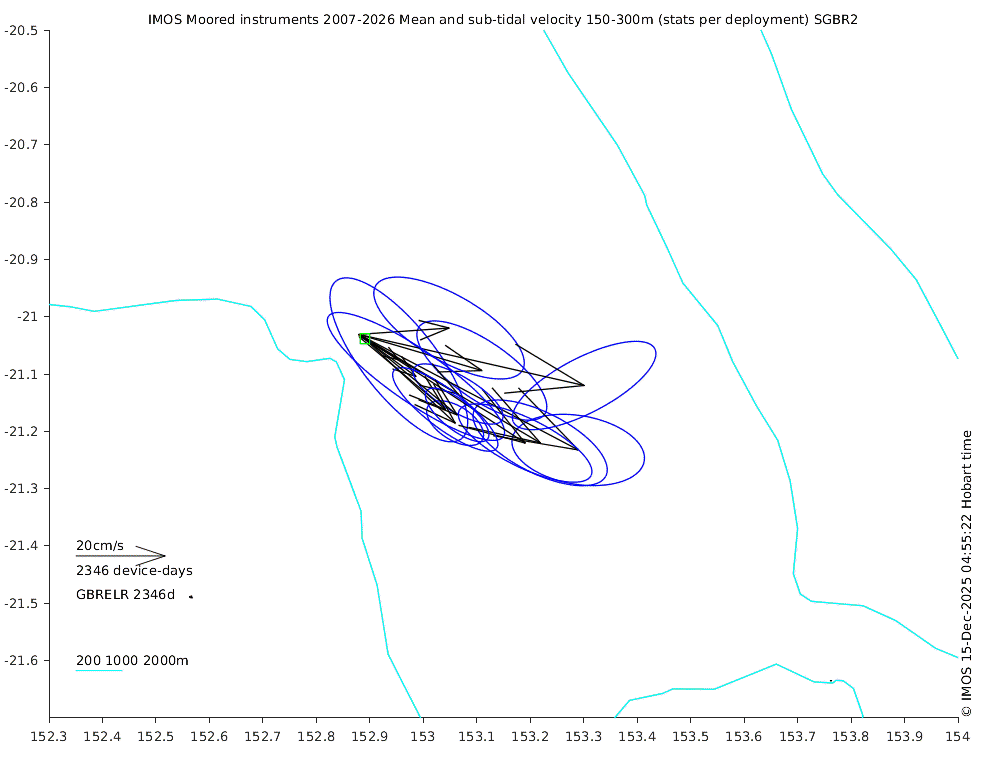 These maps show some basic analyses of the velocity data: mean (all-time in black and seasonal in colour) and sub-tidal variance for several layers and time-windows, and tidal harmonics for the depth-average velocity using the whole record. Click through to see more detailed plots of the selected dataset or to download those data from the AODN thredds server.