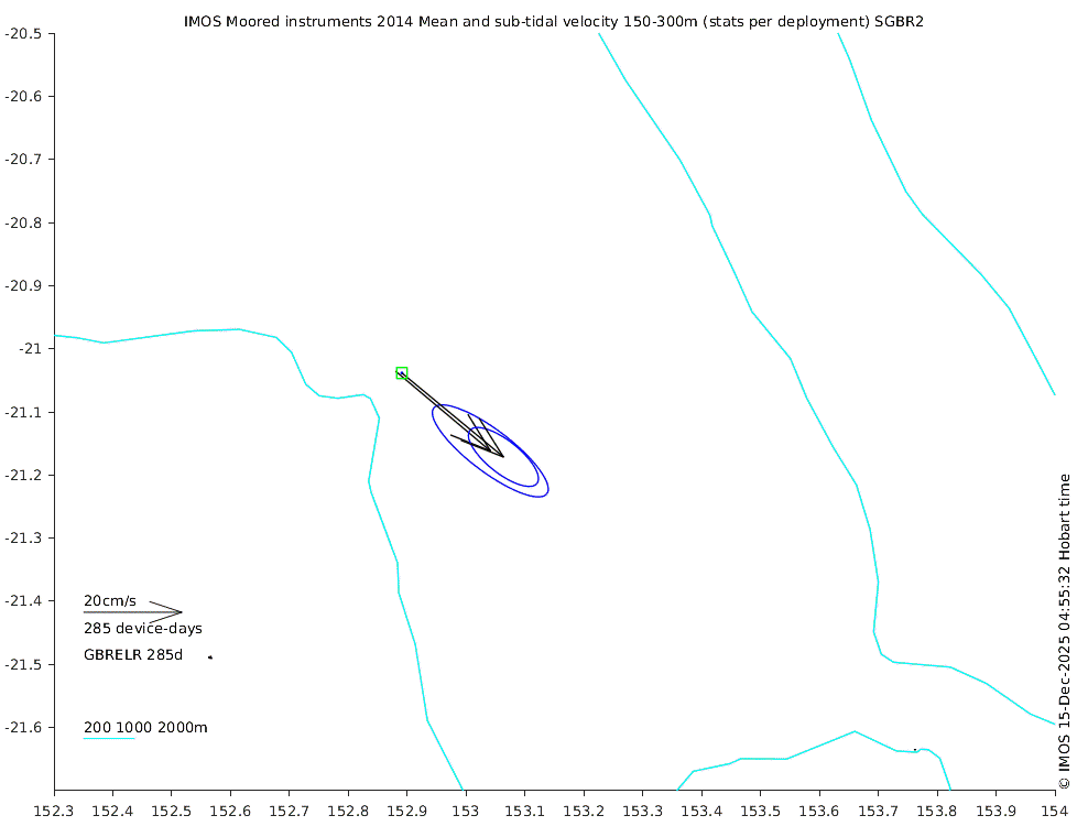 These maps show some basic analyses of the velocity data: mean (all-time in black and seasonal in colour) and sub-tidal variance for several layers and time-windows, and tidal harmonics for the depth-average velocity using the whole record. Click through to see more detailed plots of the selected dataset or to download those data from the AODN thredds server.