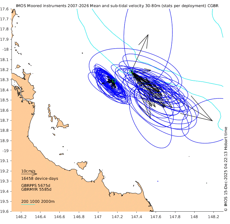 These maps show some basic analyses of the velocity data: mean (all-time in black and seasonal in colour) and sub-tidal variance for several layers and time-windows, and tidal harmonics for the depth-average velocity using the whole record. Click through to see more detailed plots of the selected dataset or to download those data from the AODN thredds server.