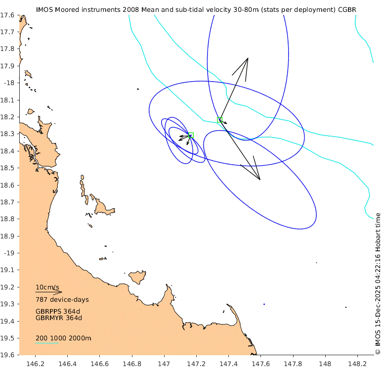 These maps show some basic analyses of the velocity data: mean (all-time in black and seasonal in colour) and sub-tidal variance for several layers and time-windows, and tidal harmonics for the depth-average velocity using the whole record. Click through to see more detailed plots of the selected dataset or to download those data from the AODN thredds server.