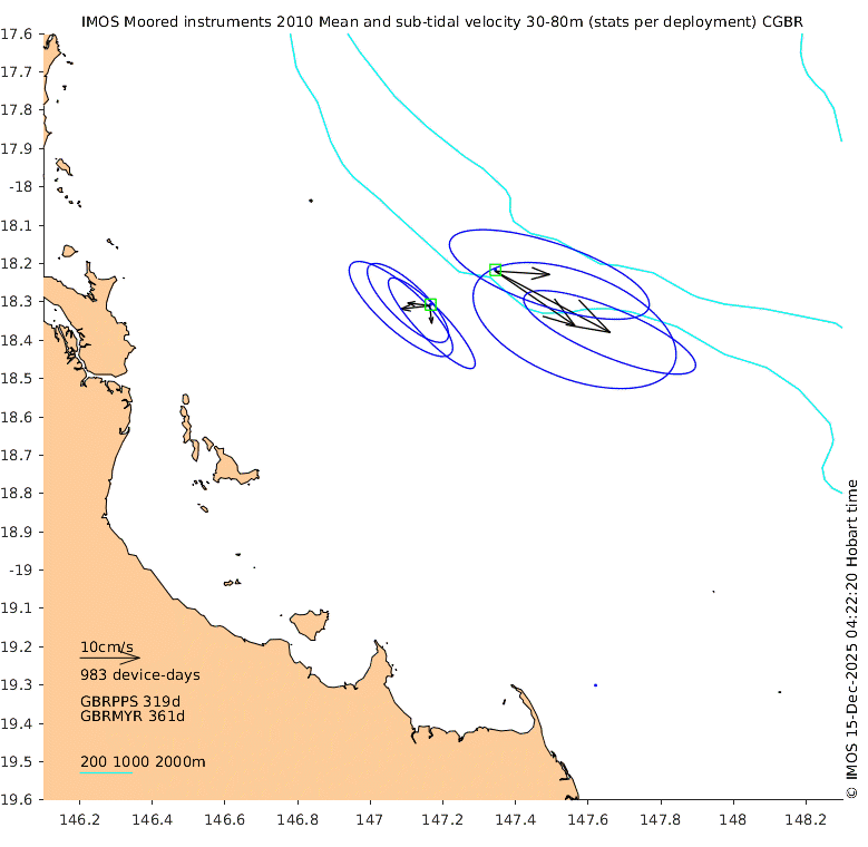 These maps show some basic analyses of the velocity data: mean (all-time in black and seasonal in colour) and sub-tidal variance for several layers and time-windows, and tidal harmonics for the depth-average velocity using the whole record. Click through to see more detailed plots of the selected dataset or to download those data from the AODN thredds server.