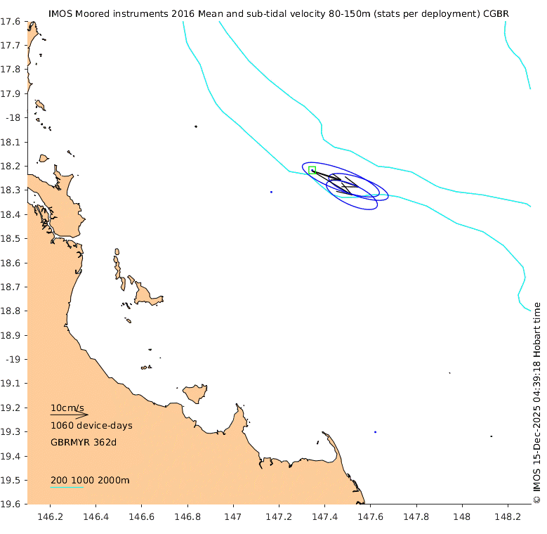 These maps show some basic analyses of the velocity data: mean (all-time in black and seasonal in colour) and sub-tidal variance for several layers and time-windows, and tidal harmonics for the depth-average velocity using the whole record. Click through to see more detailed plots of the selected dataset or to download those data from the AODN thredds server.