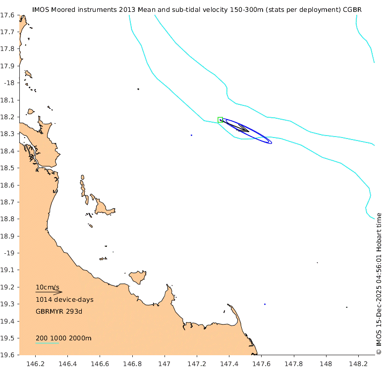 These maps show some basic analyses of the velocity data: mean (all-time in black and seasonal in colour) and sub-tidal variance for several layers and time-windows, and tidal harmonics for the depth-average velocity using the whole record. Click through to see more detailed plots of the selected dataset or to download those data from the AODN thredds server.