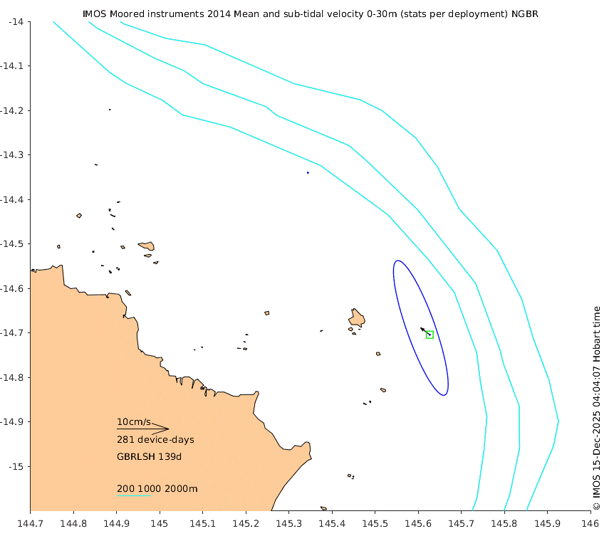 These maps show some basic analyses of the velocity data: mean (all-time in black and seasonal in colour) and sub-tidal variance for several layers and time-windows, and tidal harmonics for the depth-average velocity using the whole record. Click through to see more detailed plots of the selected dataset or to download those data from the AODN thredds server.