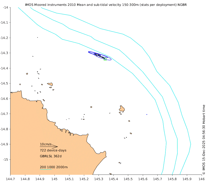 These maps show some basic analyses of the velocity data: mean (all-time in black and seasonal in colour) and sub-tidal variance for several layers and time-windows, and tidal harmonics for the depth-average velocity using the whole record. Click through to see more detailed plots of the selected dataset or to download those data from the AODN thredds server.