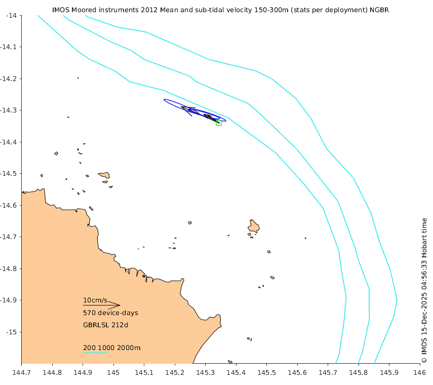 These maps show some basic analyses of the velocity data: mean (all-time in black and seasonal in colour) and sub-tidal variance for several layers and time-windows, and tidal harmonics for the depth-average velocity using the whole record. Click through to see more detailed plots of the selected dataset or to download those data from the AODN thredds server.