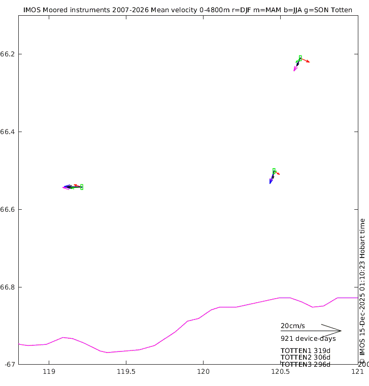 These maps show some basic analyses of the velocity data: mean (all-time in black and seasonal in colour) and sub-tidal variance for several layers and time-windows, and tidal harmonics for the depth-average velocity using the whole record. Click through to see more detailed plots of the selected dataset or to download those data from the AODN thredds server.