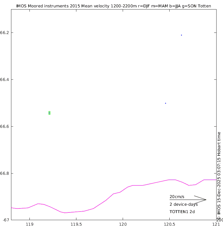 These maps show some basic analyses of the velocity data: mean (all-time in black and seasonal in colour) and sub-tidal variance for several layers and time-windows, and tidal harmonics for the depth-average velocity using the whole record. Click through to see more detailed plots of the selected dataset or to download those data from the AODN thredds server.