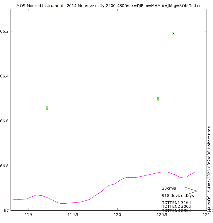 These maps show some basic analyses of the velocity data: mean (all-time in black and seasonal in colour) and sub-tidal variance for several layers and time-windows, and tidal harmonics for the depth-average velocity using the whole record. Click through to see more detailed plots of the selected dataset or to download those data from the AODN thredds server.
