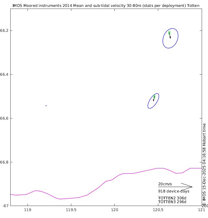 These maps show some basic analyses of the velocity data: mean (all-time in black and seasonal in colour) and sub-tidal variance for several layers and time-windows, and tidal harmonics for the depth-average velocity using the whole record. Click through to see more detailed plots of the selected dataset or to download those data from the AODN thredds server.